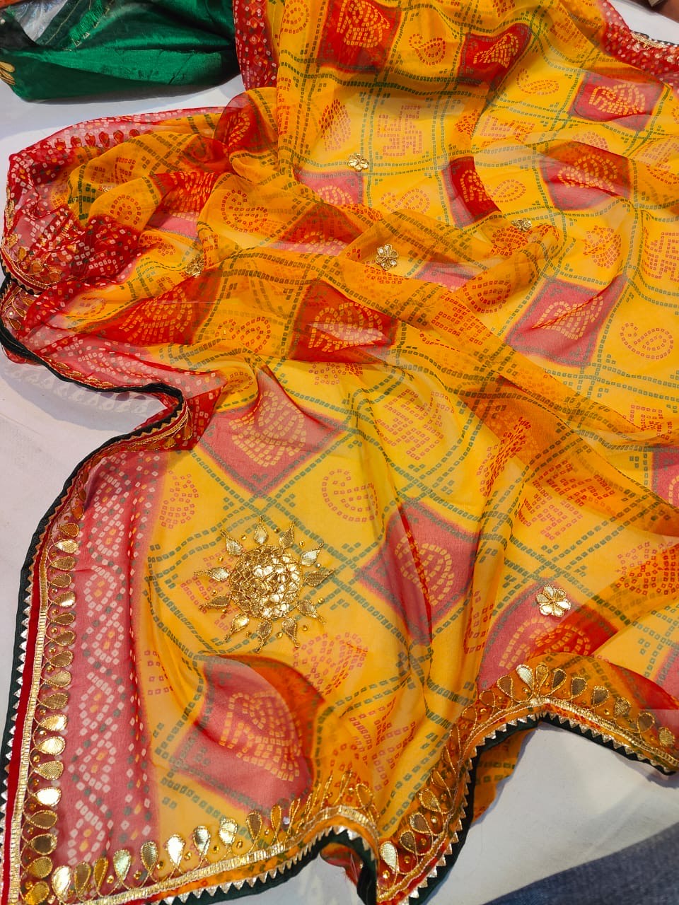 This is Rajasthani Printed Georgette Bandhani Saree In Multi Colour With Golden Gotta Booti. This Saree has Contrast Green colour Blouse .
